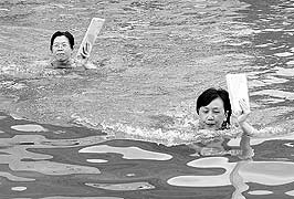 照片上這兩位女士手上拿著個大信封在水里游,這是廣西壯族自治區(qū)桂林市郵政局8月30日舉辦的員工游泳比賽上的新項目——水上送郵件。為豐富員工的業(yè)余文化生活,桂林局每年都舉辦一次員工游泳比賽,今年除了常規(guī)的比賽項目外,還增加了這個很有趣味的項目。別小瞧這個“水上送郵件”比賽,難度可不小呢,既要游得快,又要保證不把郵件弄濕,而且是用單手劃水,參賽者個個都是鉚足了勁游,贏得觀看者的滿堂彩。