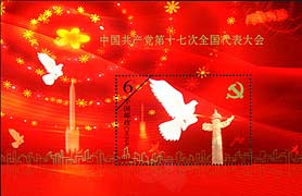 為慶祝中國(guó)共產(chǎn)黨第十七次全國(guó)代表大會(huì)的勝利召開,將于10月15日發(fā)行《中國(guó)共產(chǎn)黨第十七次全國(guó)代表大會(huì)》紀(jì)念郵票一套2枚,小型張1枚。