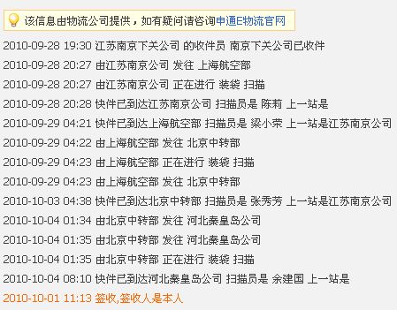 2010年9月28日,在淘寶購(gòu)物選擇了幾個(gè)錢包和一條腰帶,賣家不錯(cuò),竟然包郵了!于是馬上付款,等著賣家發(fā)貨。賣家很棒,28號(hào)當(dāng)天就給發(fā)了申通快遞的申通E物流。好呀,期待著9月30號(hào)應(yīng)該能到秦皇島吧。